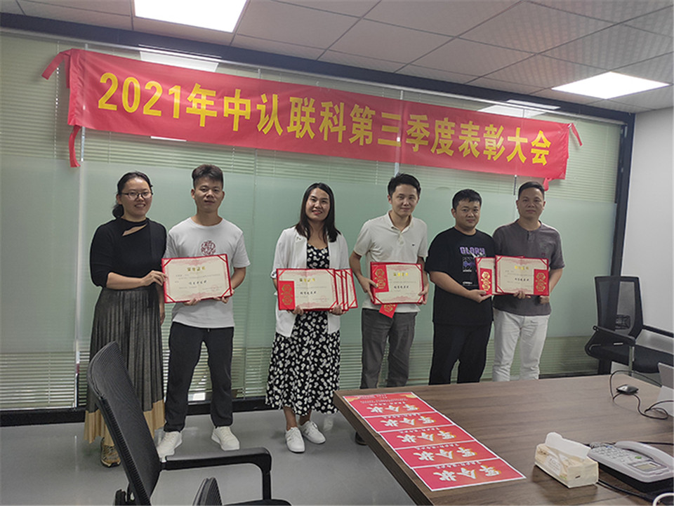 為增強公司員工的內(nèi)部凝聚力,提升公司的企業(yè)形象及競爭力,中認聯(lián)科檢測技術有限公司于10月16日下午4點,在東莞會議室舉行了2021年中認聯(lián)科第三季度表彰大會。銷售部全體員工和領導參與了本次會議。